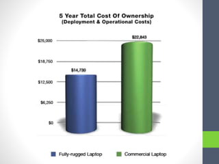 This document provides an overview of rugged computing solutions from Miltec, Panasonic Toughbook, Handheld Europe, and iKey. It describes Panasonic Toughbook laptops, tablets, and their testing process. It also outlines Handheld Europe's line of rugged handhelds, tablets, and notebooks. The document shares case studies on how these solutions have helped with tasks like electrical meter reading and zoo ticketing. It concludes with an overview of iKey and the advantages of its rugged accessories, product lines, and a medical case study.
