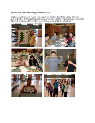 The student organized a winter-themed activity for December 17, 2009 where students decorated with Christmas drawings, made paper plate ice skates, had snowball fights with yarn balls, played a game to spot reindeer, and participated in fitness games, with prizes handed out at the end.
