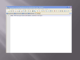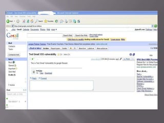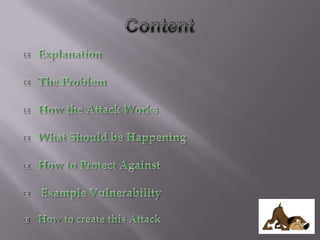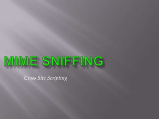 The document discusses content sniffing vulnerabilities in web browsers. It explains that browsers try to determine the true content type of a file, even if the server provides the wrong content type header. This allows an attacker to craft a file, like an image, that is also valid HTML containing JavaScript. When the browser content sniffs the file and treats it as HTML, the JavaScript will execute in the context of the vulnerable website. The document provides examples of how this can be used to steal cookies from users and perform cross-site scripting attacks. It recommends server and browser fixes like ensuring correct content type headers and adding headers to disable content sniffing.