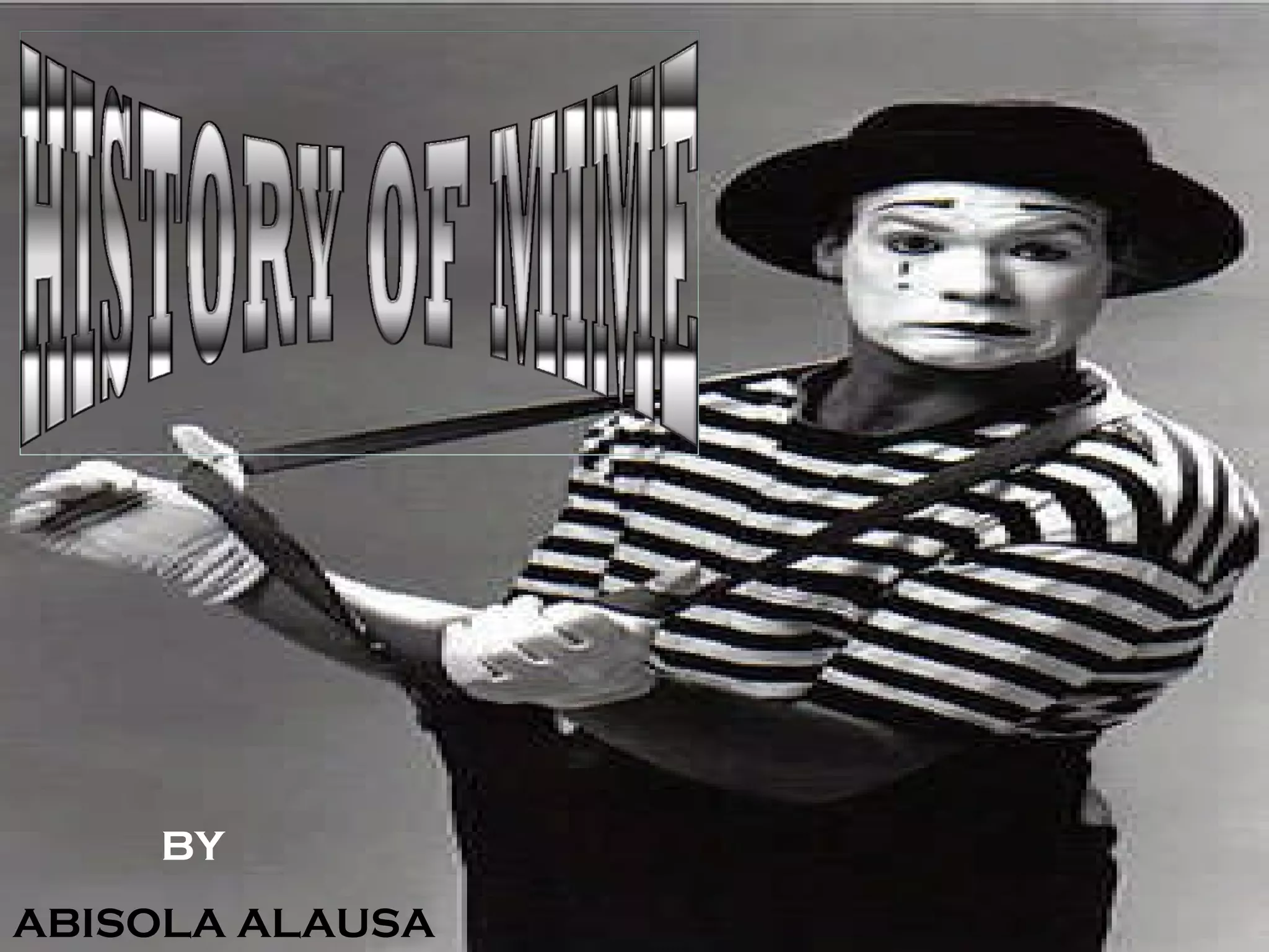 Mime originated in ancient Greece as a form of silent performance in theaters without words using only gestures and movements. It gained popularity in ancient Rome and during the Renaissance period in Italy. Marcel Marceau was one of the most famous 20th century mimes who performed globally and helped popularize the art of mime. Today, mime continues to be performed and Rowan Atkinson is considered one of the best modern mimes.