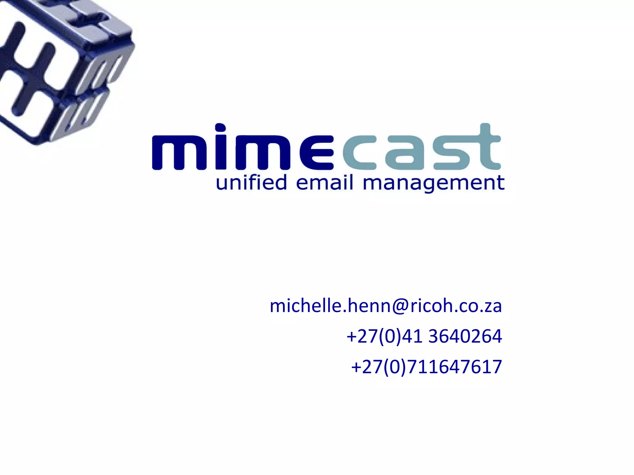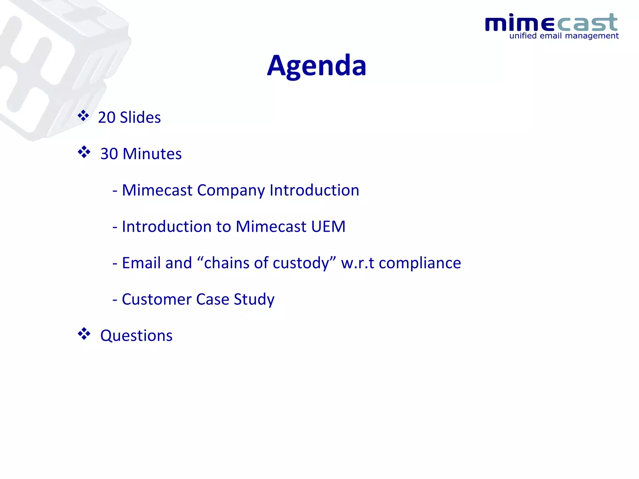 This document provides an agenda for a Mimecast company introduction presentation. The presentation will cover Mimecast's email security and archiving software-as-a-service, including its unified email management platform, continuity capabilities, compliance features, and customer case studies. Mimecast's solution aims to reduce costs and complexity for email management while providing security, archiving, e-discovery and other email functions through a single cloud-based platform.