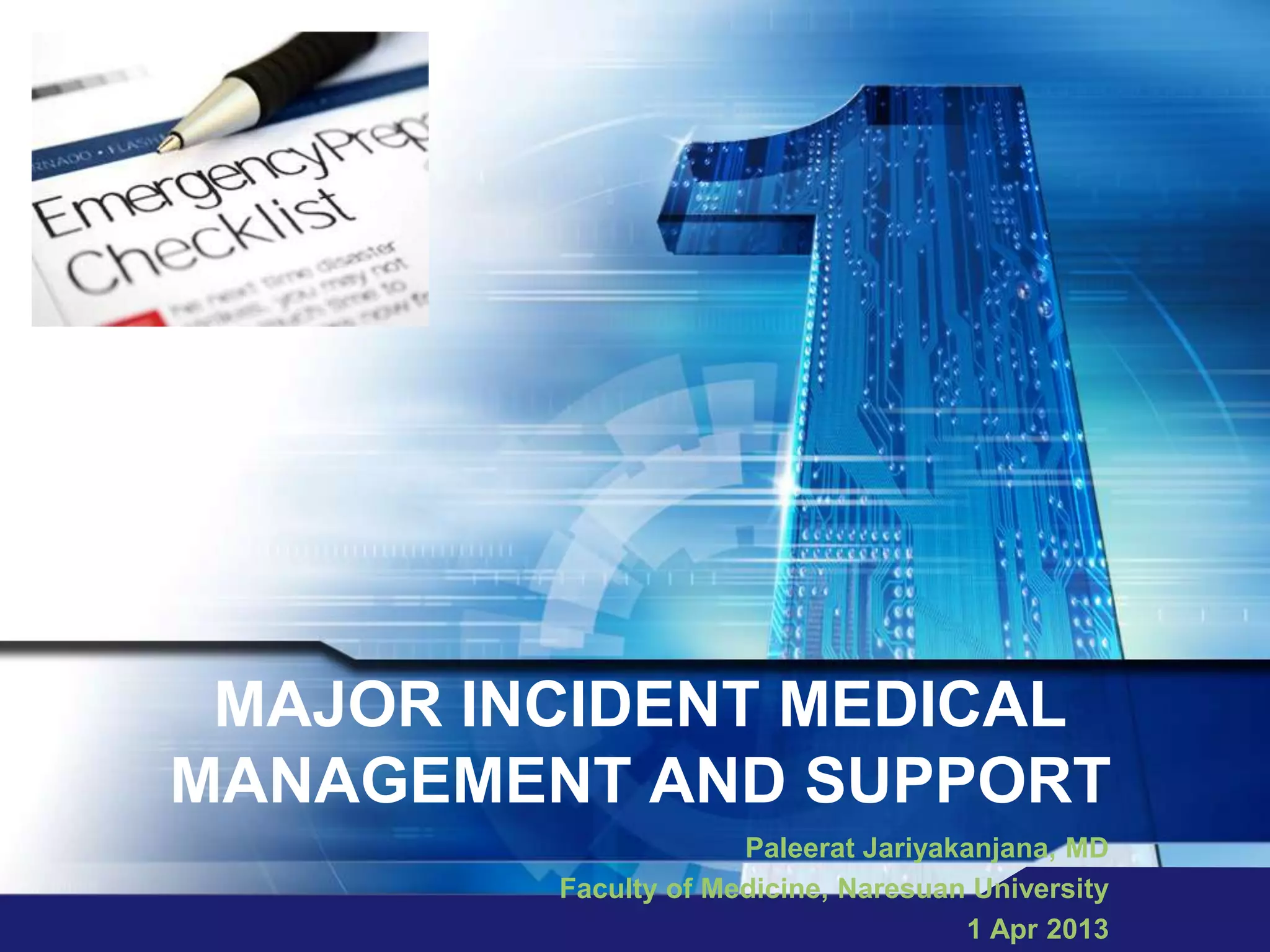 The document discusses Major Incident Medical Management and Support (MIMMS), which is a training course that teaches a systematic approach for managing medical care during mass casualty incidents. It describes the DISASTER paradigm and MIMMS principles for command, safety, communication, assessment, triage, treatment, transport, and recovery. Key aspects covered include incident command structure, safety procedures, communication protocols, triage categories and methods, and priorities for treatment and transport to various hospitals based on patient needs.