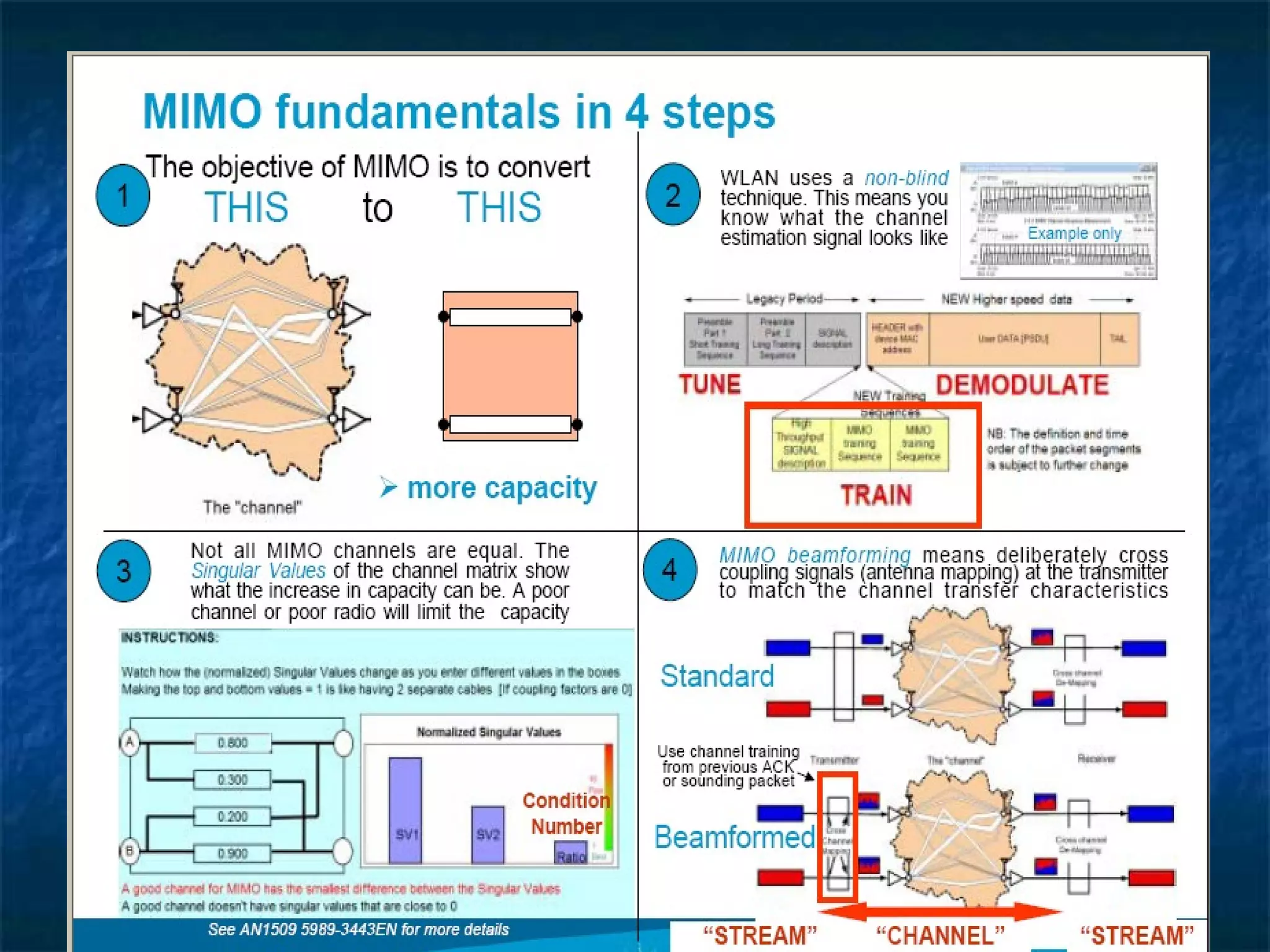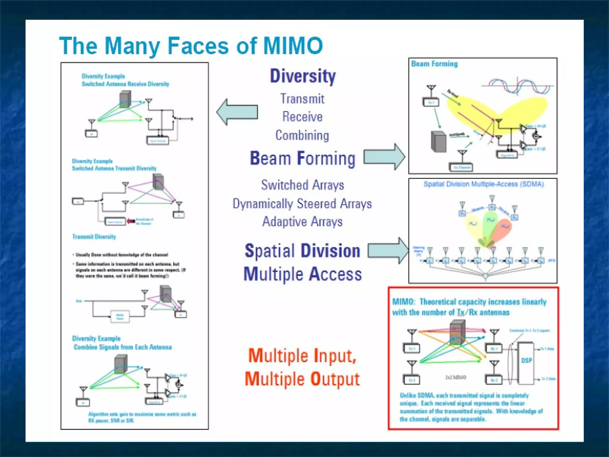 This document provides an overview of MIMO (Multiple Input Multiple Output) technology and its use in 802.11n wireless networks. MIMO works by using multiple antennas at both the transmitter and receiver to improve communication in three ways: by providing signal diversity to increase range and resilience, by enabling spatial multiplexing to increase data rates, and by allowing beamforming to focus signals in certain directions. The 802.11n standard will incorporate MIMO to achieve data rates up to 600Mbps using techniques like multi-path mitigation, modulation schemes, channel coding, and frame formatting adapted for MIMO transmissions. MIMO thus allows 802.11n to continue advancing wireless LAN speeds and performance.