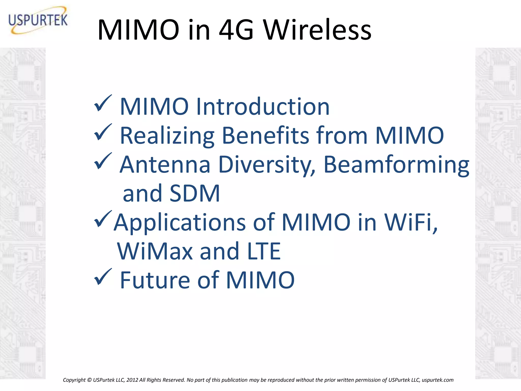 The document discusses MIMO (multiple-input multiple-output) technology in 4G wireless networks. It describes how MIMO uses multiple antennas at both the transmitter and receiver to provide benefits like increased throughput, robustness to fading, and the ability to support new broadband applications. It discusses various MIMO techniques including antenna diversity, beamforming, and space division multiplexing and how they improve the signal-to-noise ratio and mitigate multipath interference. MIMO has been adopted in technologies like WiFi, WiMAX, and LTE to provide these benefits and enhancements to wireless communications.