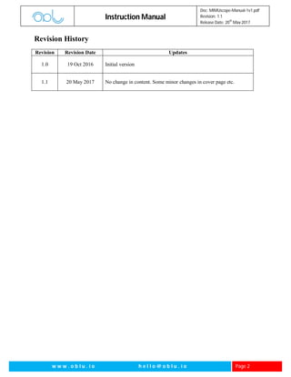 The Mimuscope instruction manual provides detailed guidance on using the Mimuscope software, a Windows-based interface for OBLO devices that analyzes gait and provides real-time data plotting for accelerometers and gyroscopes. It outlines features such as raw and calibrated data processing, pedestrian dead reckoning (PDR), settings adjustments, and example use cases for various applications like mapping and robotics. Released in May 2017, the manual includes revision history, comprehensive instructions for input and output handling, and various GUI features to enhance user interaction.