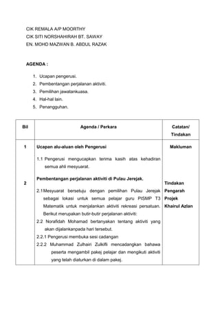 Mesyuarat persatuan pendidikan jasmani diadakan pada 18 Julai 2012 membincangkan perjalanan aktiviti rekreasi di Pulau Jerejak dan pemilihan jawatankuasa. Peserta dibahagikan kepada dua kumpulan untuk melancarkan aktiviti, dengan cadangan pengangkutan menggunakan kenderaan persendirian dan pakaian berwarna oren. Mesyuarat ditangguhkan pada jam 4.30 petang setelah semua agenda dibincangkan.
