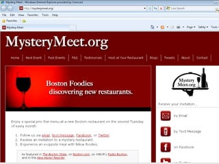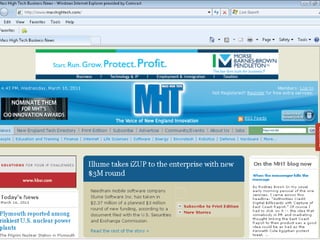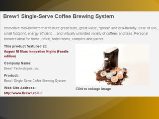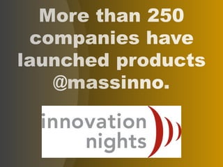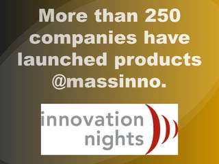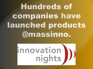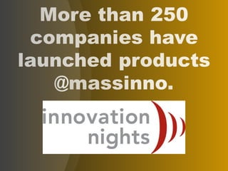 Mass Innovation Nights hosts monthly launch parties that feature 10 new products. Attendees can vote on their favorite products, and the top 4 voted products earn a 5 minute pitch to the crowd. Over 300 companies have launched products at previous Mass Innovation Night events, which are attended by hundreds of people each month.