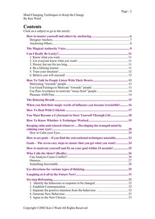 This document provides techniques for changing one's mindset and influencing others. It discusses anchoring, where a state such as confidence can be anchored to a physical cue through repeated association, allowing one to re-access that state on cue. Designer anchors can be intentionally created for specific states. Anchors can also be applied to influence others' states. The "magical authority voice" is discussed, noting how intonation patterns elicit deference similarly to a parent's authority voice. Newsreaders are trained to use this voice to increase credibility and impact. With practice, one can learn to use voice intentionally to influence others and avoid being influenced irrationally. The document provides many mindset changing techniques in brief form.