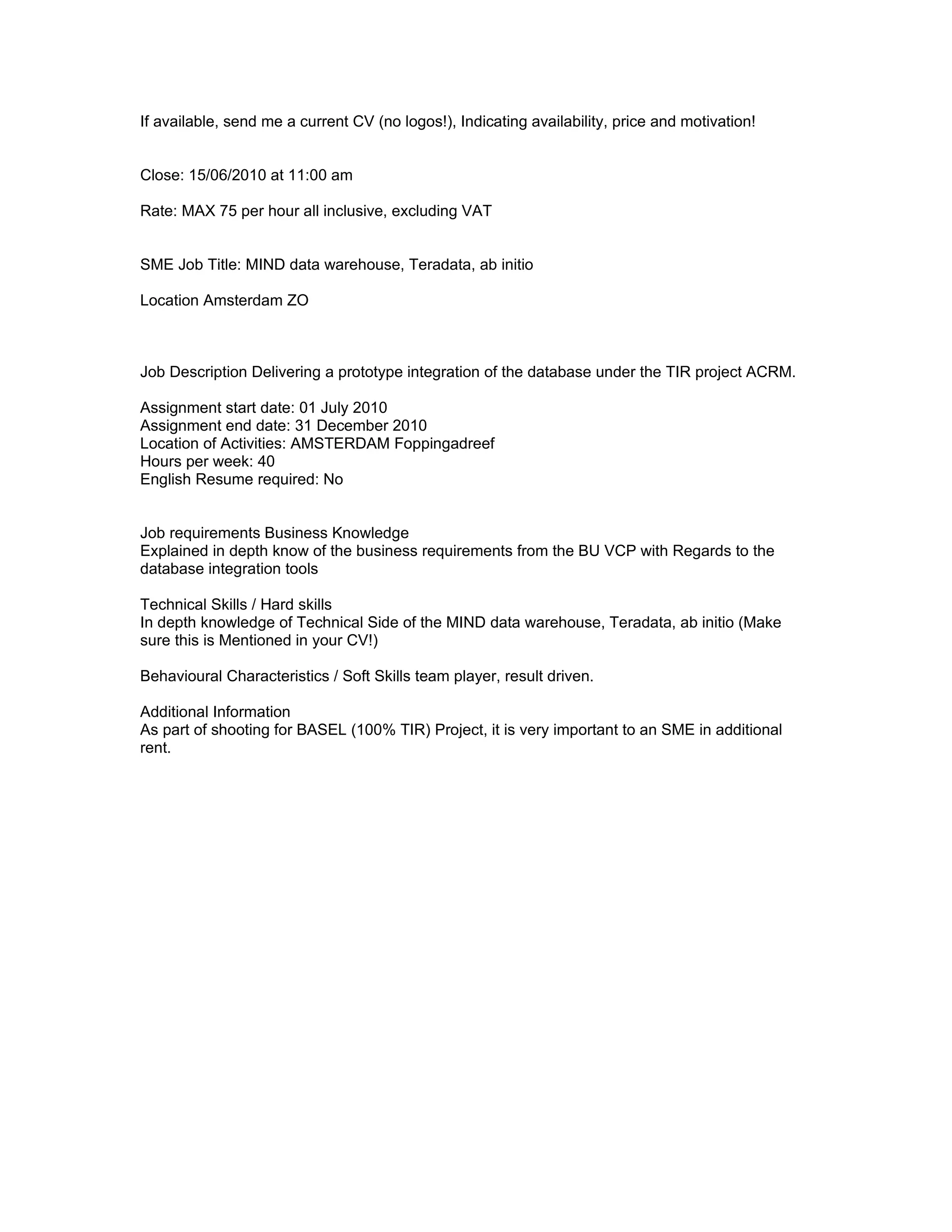 The document requests a current CV be sent by June 15th indicating availability from July 1st to December 31st, 2010 for a data warehouse integration prototype project in Amsterdam paying up to 75 euros per hour. The ideal candidate has in-depth business knowledge of integration requirements and technical skills in MIND data warehouse, Teradata, and Ab Initio, and is a team player and result-driven.