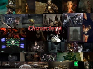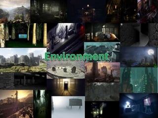 The document provides a mind map for a horror game that includes various characters (e.g. witch, monster, demon), environments (e.g. haunted house, grave, forest), weapons (e.g. gun, knife, magic cloth), treasures (e.g. gold, diamond) and other items (e.g. bomb, bullet). It notes that the game will be a cartoon horror hack and slash game where the player kills as many characters as possible to gain points. Research was conducted on themes, storyboards, weapons, characters and other elements to develop game ideas. The target audience is identified as young boys aged 9-12.