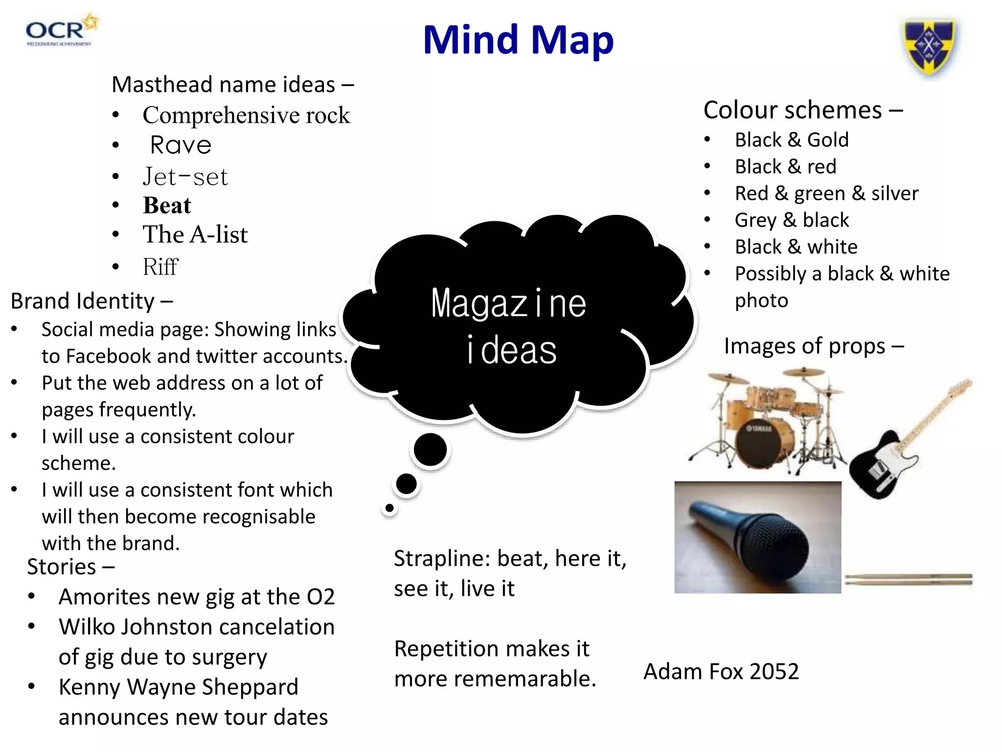 The document contains ideas for naming a new music magazine, potential colour schemes for the magazine's branding, elements of the magazine's brand identity like using consistent fonts and colours across social media and print, sample article ideas about music gigs and tours, and a note about using repetition to make the magazine's strapline more memorable.