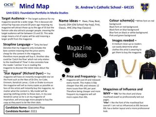 The document outlines ideas for a magazine focused on old school hip hop music. It discusses potential names for the magazine, color schemes for the design, and a target audience of 15 to 35 year olds. It also lists images, straplines, influential magazines, the use of featuring popular artists on the cover to drive sales, and a proposed price and frequency of the magazine being released monthly at £4 per issue.