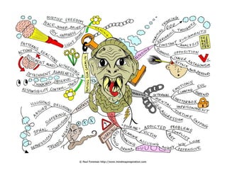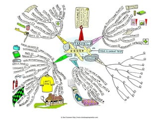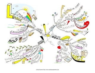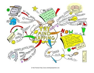 The document features hand-drawn mind map examples by Paul Foreman and provides 100 reasons for using mind mapping. It includes resources for learning drawing techniques and offers links to additional mind map examples and educational content. For further information, readers can explore websites related to mind mapping, follow Paul on social media, and access various mind map libraries.