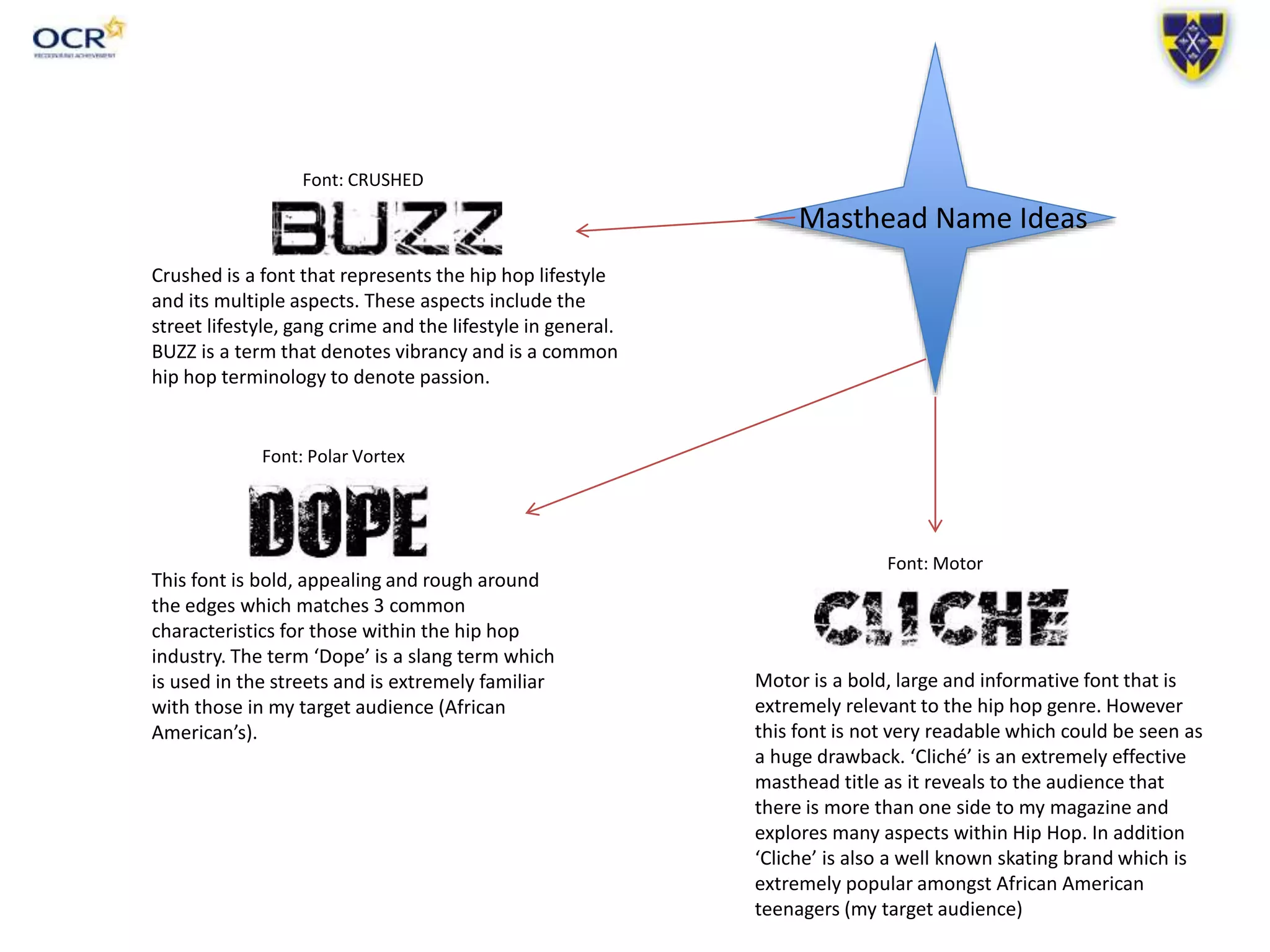 1) Four font options for the masthead name - "Crushed", "BUZZ", "Polar Vortex Dope", and "Motor Cliché" - along with explanations of how each relates to hip hop culture.