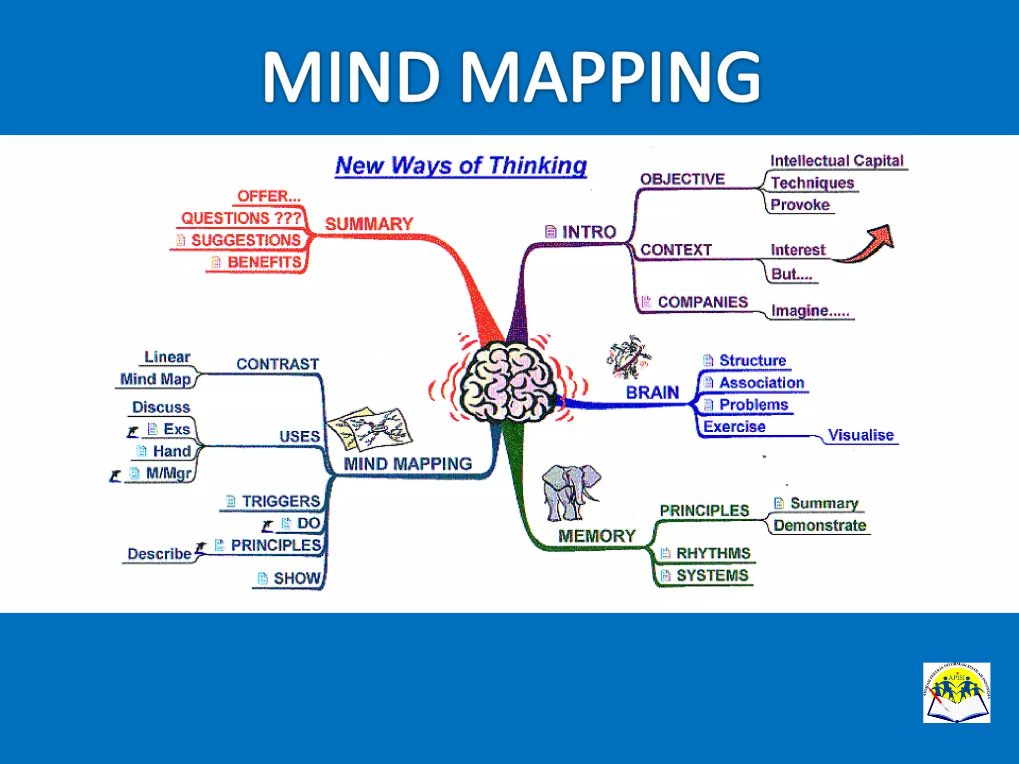 Mind map adalah teknik berpikir yang kreatif dan efektif untuk mengorganisir ide serta informasi, memungkinkan penggunanya melihat hubungan antara berbagai konsep. Alat ini bermanfaat dalam merencanakan, memecahkan masalah, dan mengingat informasi secara efisien. Untuk membuat mind map, diperlukan kertas kosong, alat tulis, dan kreativitas, dengan langkah-langkah yang melibatkan penggunaan gambar, warna, dan kata kunci.