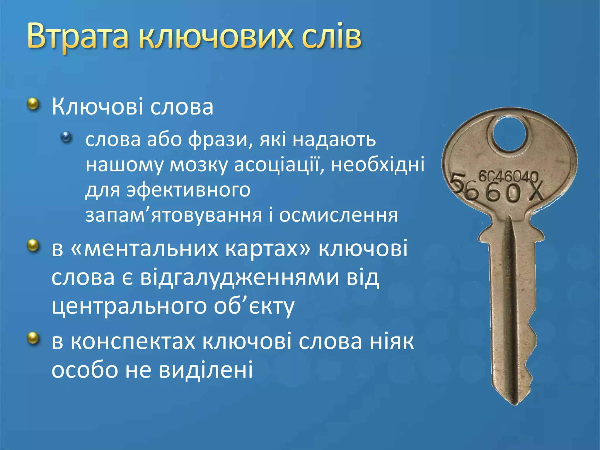 Втрата ключових слівКлючовіслова слова або фрази, які надають нашому мозку асоціації, необхідні для эфективного запам’ятовування і осмисленняв «ментальних картах» ключові слова є відгалудженнями від центрального об’єктув конспектах ключові слова ніяк особо не виділені