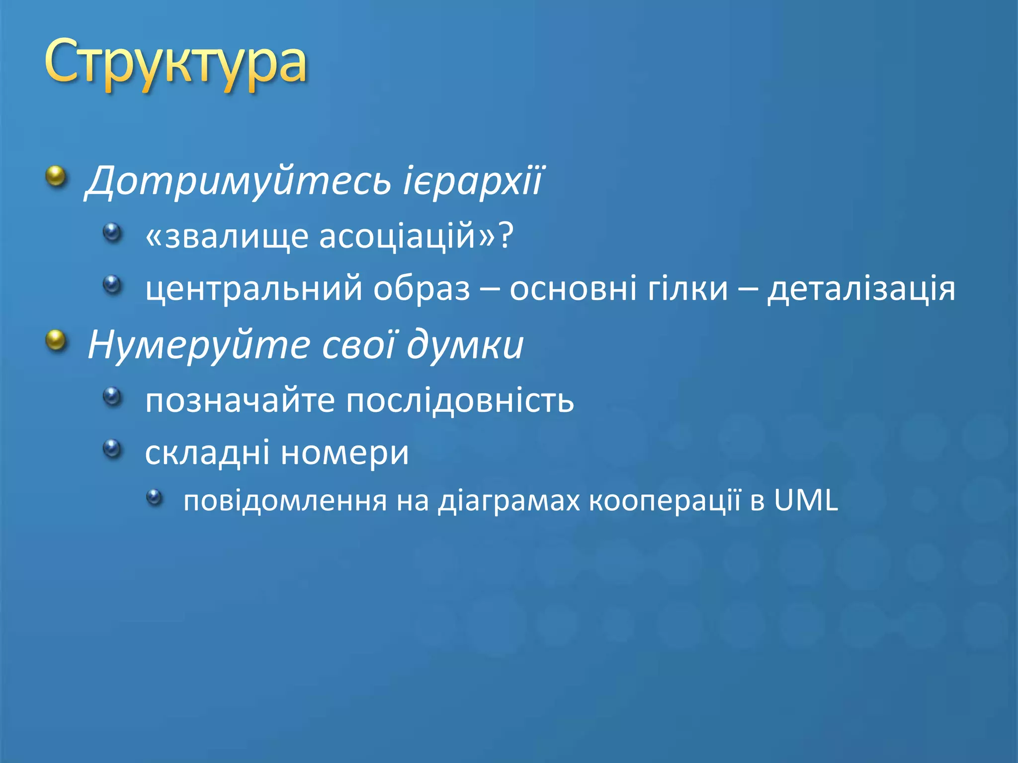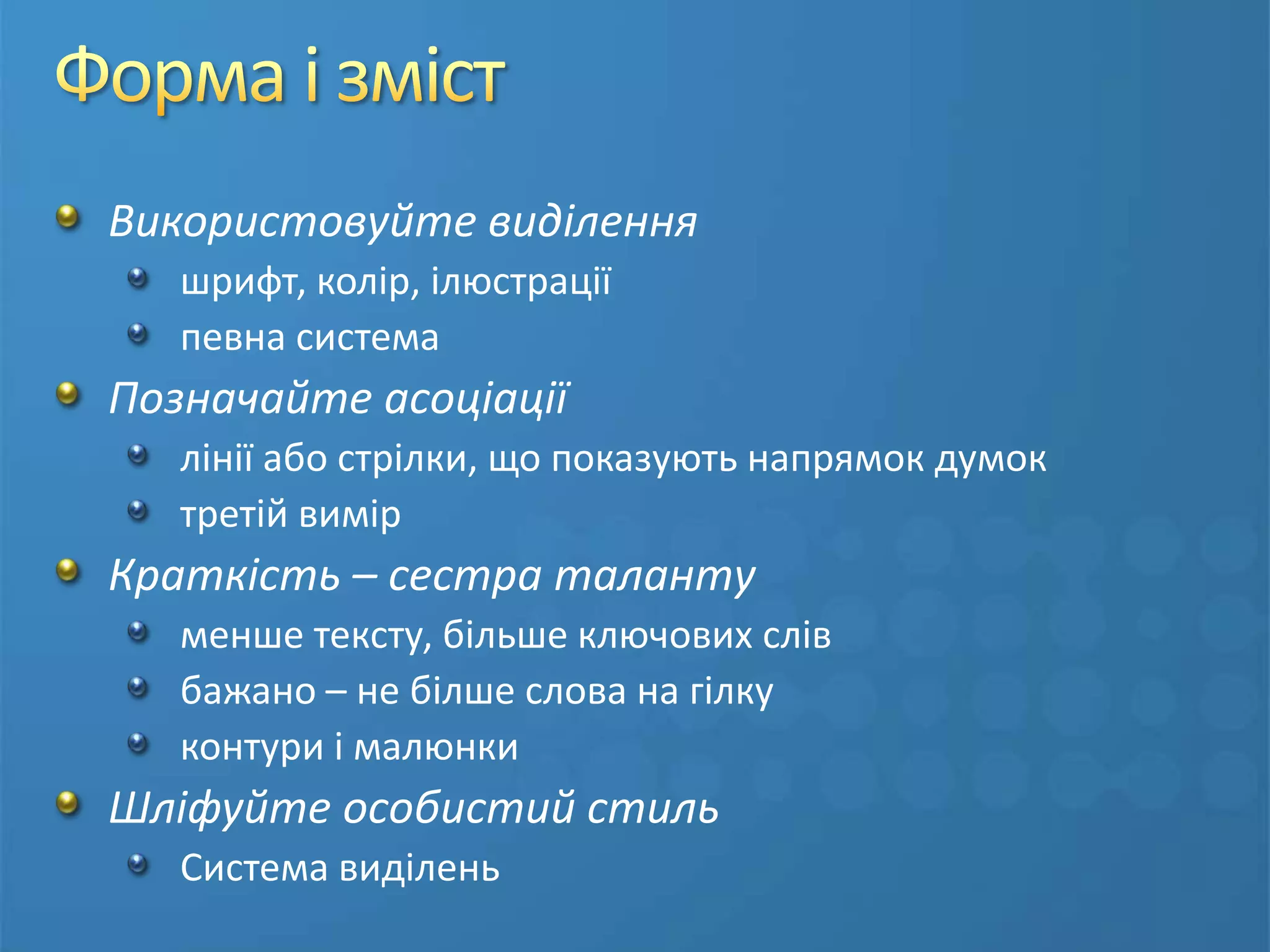 Форма і змістВикористовуйтевиділенняшрифт, колір, ілюстраціїпевна система Позначайте асоціаціїлінії або стрілки, що показують напрямок думоктретій вимірКраткість – сестра талантуменше тексту, більше ключових слівбажано – не білше слова на гілкуконтури і малюнкиШліфуйте особистий стильСистема виділень