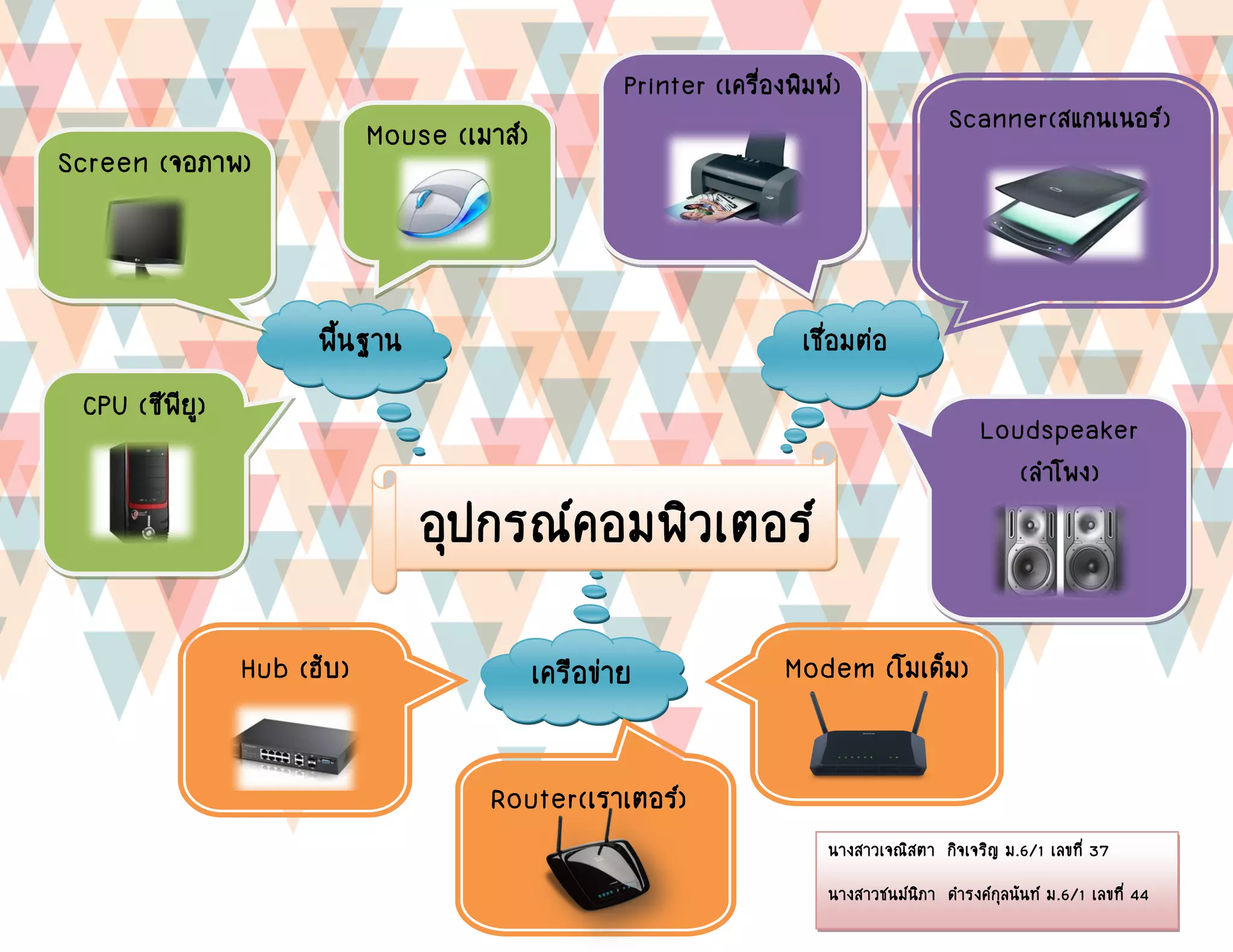 (ซีพียู) Screen (จอภาพ) Mouse (เมาส์) Scanner(สแกนเนอร์) Loudspeaker (ลาโพง) Printer (เครื่องพิมพ์) นางสาวเจณิสตา กิจเจริญ ม.6/1 เลขที่ 37 นางสาวชนม์นิภา ดารงค์กุลนันท์ ม.6/1 เลขที่ 44