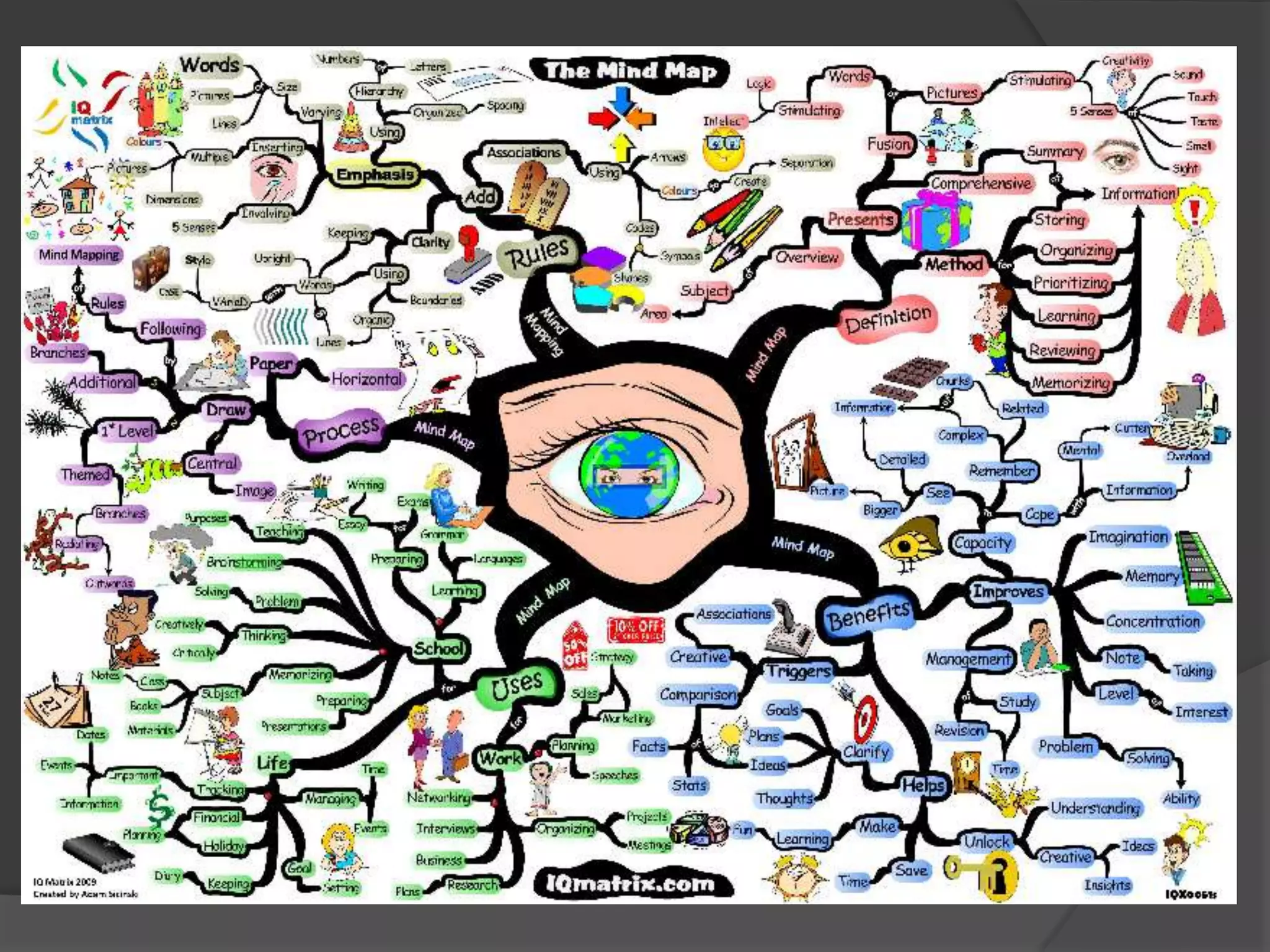 Mind mapping is a visual thinking tool that represents ideas radially around a central concept. It reflects how the brain naturally thinks in an associative way. Tony Buzan popularized mind mapping as a technique to improve memory, problem solving, note taking and creativity. An effective mind map uses elements like colors, images, branches of curved lines with one word per line to stimulate associations and help generate new ideas. Famous geniuses like Da Vinci and Darwin were believed to use mind mapping type techniques to develop their innovative thoughts.