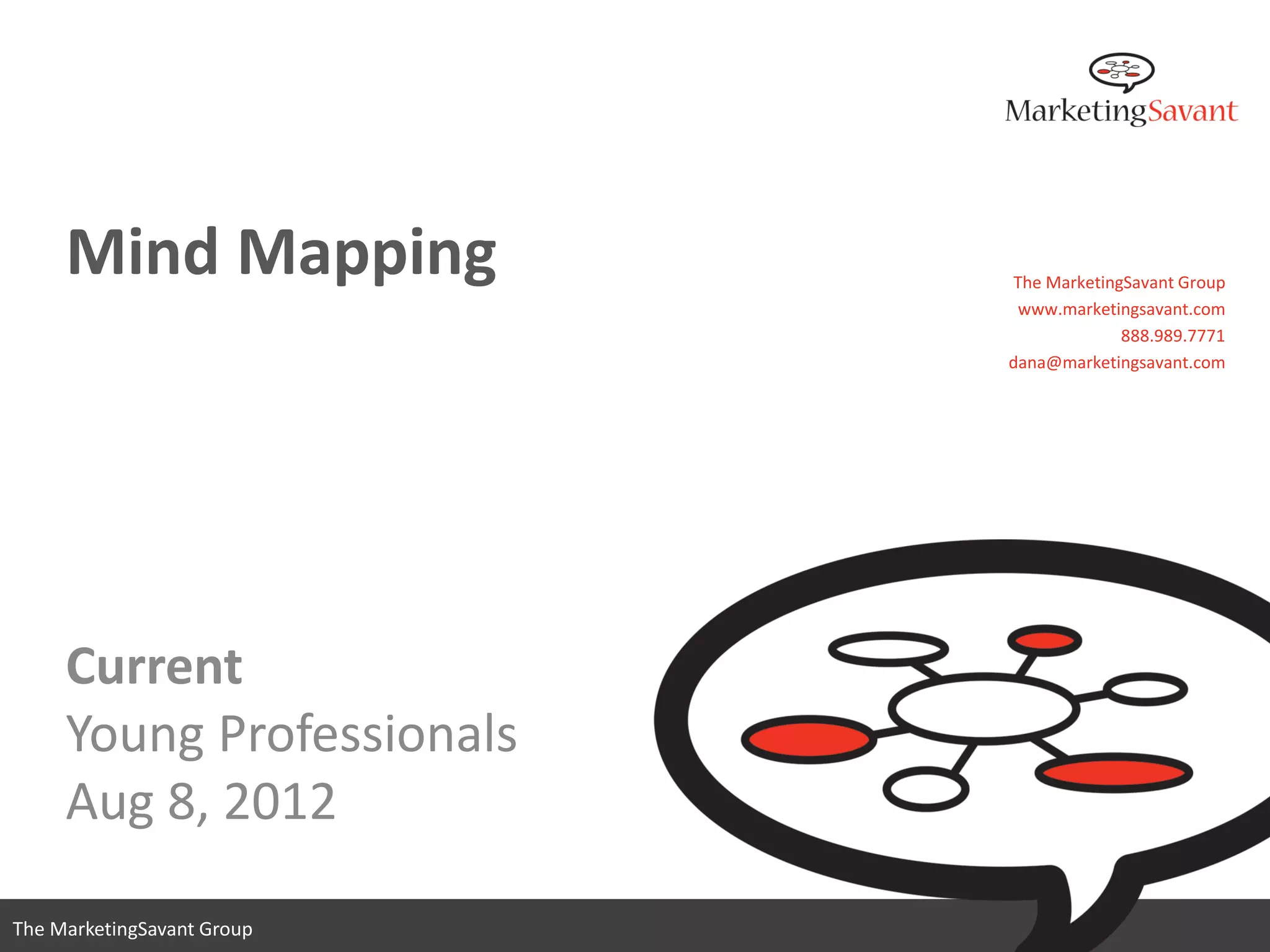 The document discusses mind mapping and provides instructions on how to create a mind map. It explains that mind mapping involves radiating ideas from a central concept in a nonlinear visual structure that mirrors the way the brain associates information. The document emphasizes that mind mapping improves memory, generates more creative ideas efficiently compared to linear notes, and leverages the brain's natural associative thinking. It provides guidelines for constructing a basic mind map, such as starting with a central image or keyword, radiating branches of related ideas, and adding subtopics without restrictions.