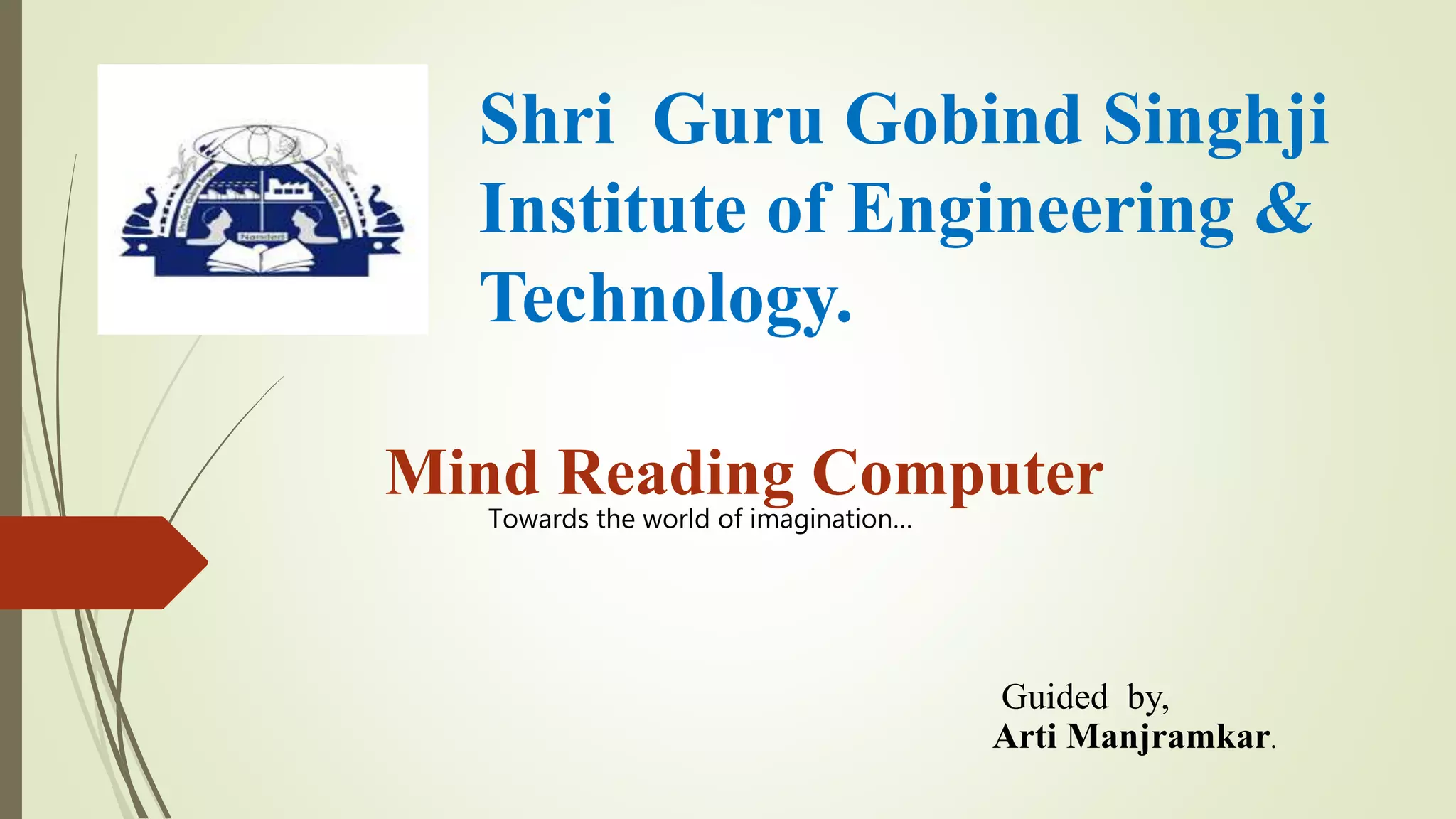 The document discusses mind reading computers. It describes how these computers analyze facial expressions in real time to infer mental states using software that identifies 24 facial points. The computers could support applications like detecting driver states. The technology works by measuring blood volume and oxygen around the brain using functional near-infrared spectroscopy. Users would wear futuristic headbands that read the brain to allow computers to adjust based on individual minds. While this raises privacy issues, it may help communication for disabled people.