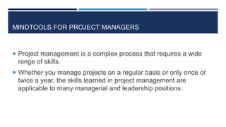 This document provides an overview of tools and resources available on the MindTools.com website to help with project management. MindTools.com has over 1,000 resources to help people be effective managers and leaders. It provides assessments to evaluate skills, frameworks and tools for project planning and scheduling, stakeholder management, and change management. MindTools.com aims to teach 50 individual project management skills through frameworks, tools and assessments.