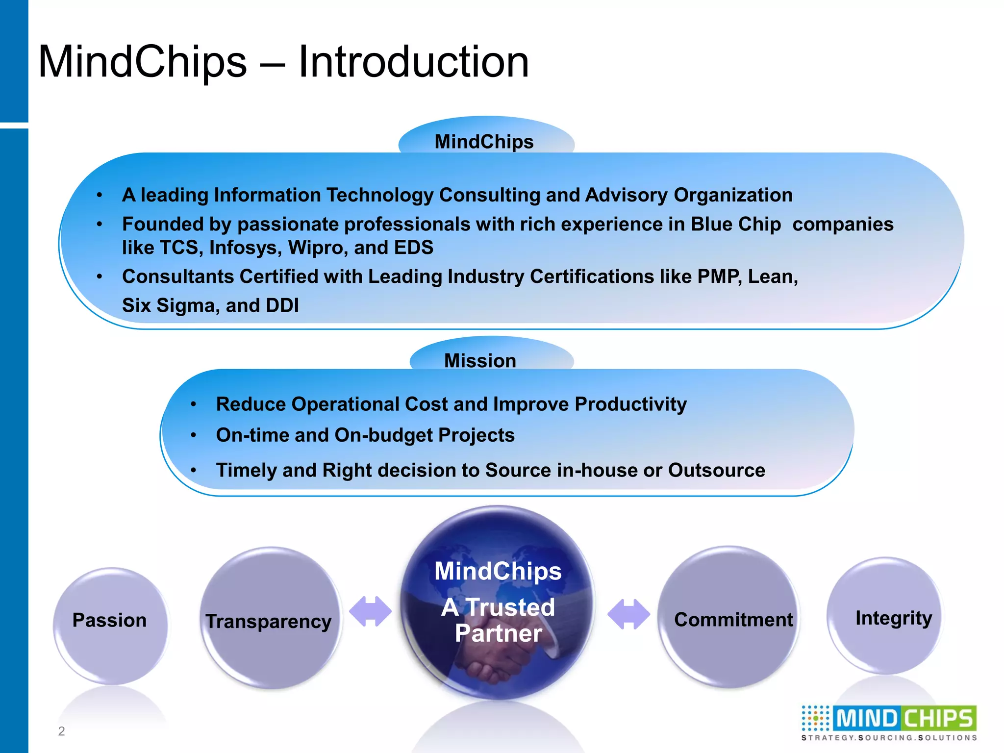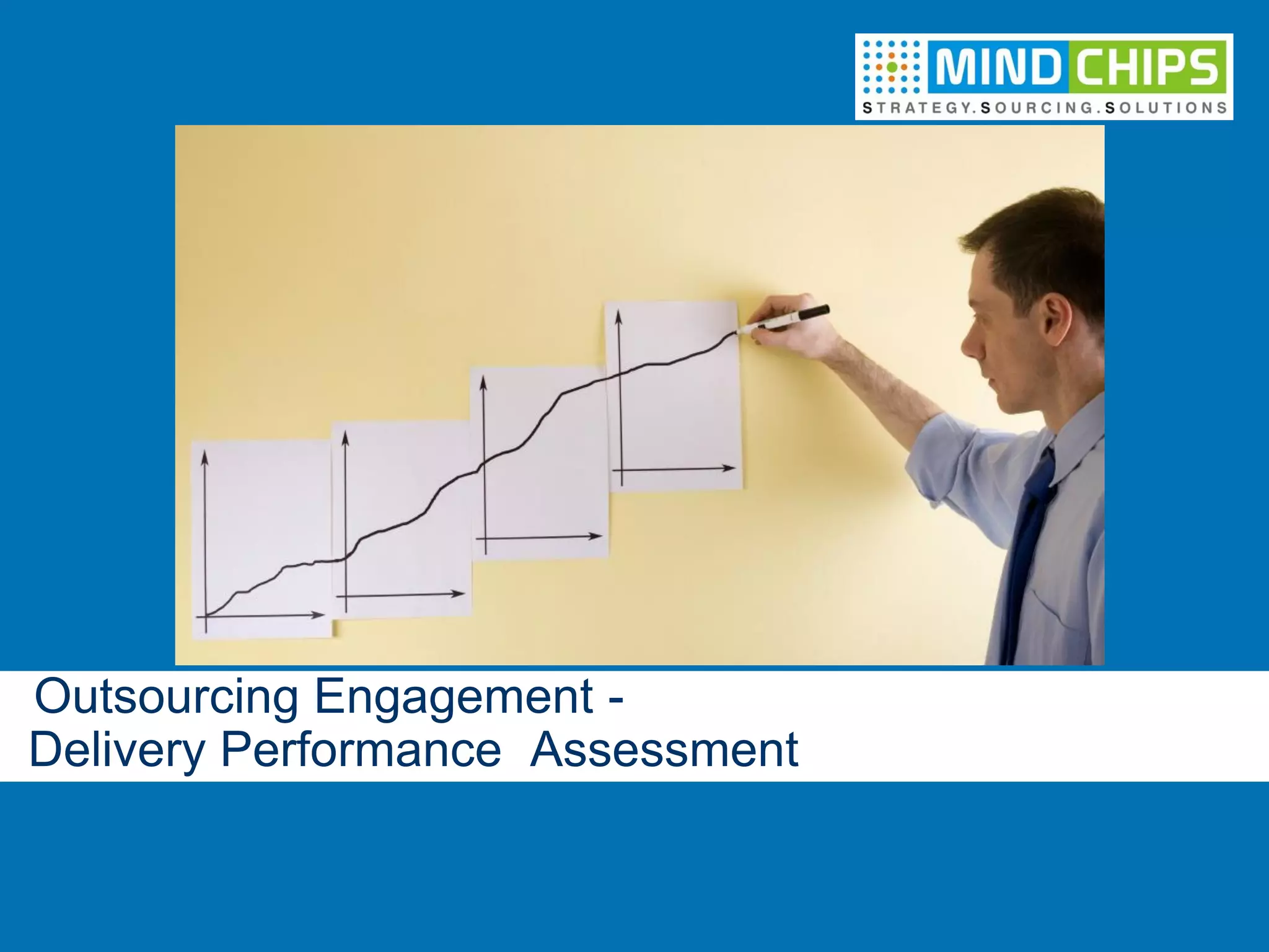 MindChips is an IT consulting firm that provides outsourcing advisory services to help clients reduce costs, improve project delivery, and make informed sourcing decisions. They assess outsourcing engagements to identify challenges, benchmark performance, and provide recommendations. Their approach involves collecting data through surveys, interviews, and analysis to deliver a report with performance ratings, an action plan, and governance practices to improve the outsourcing relationship.