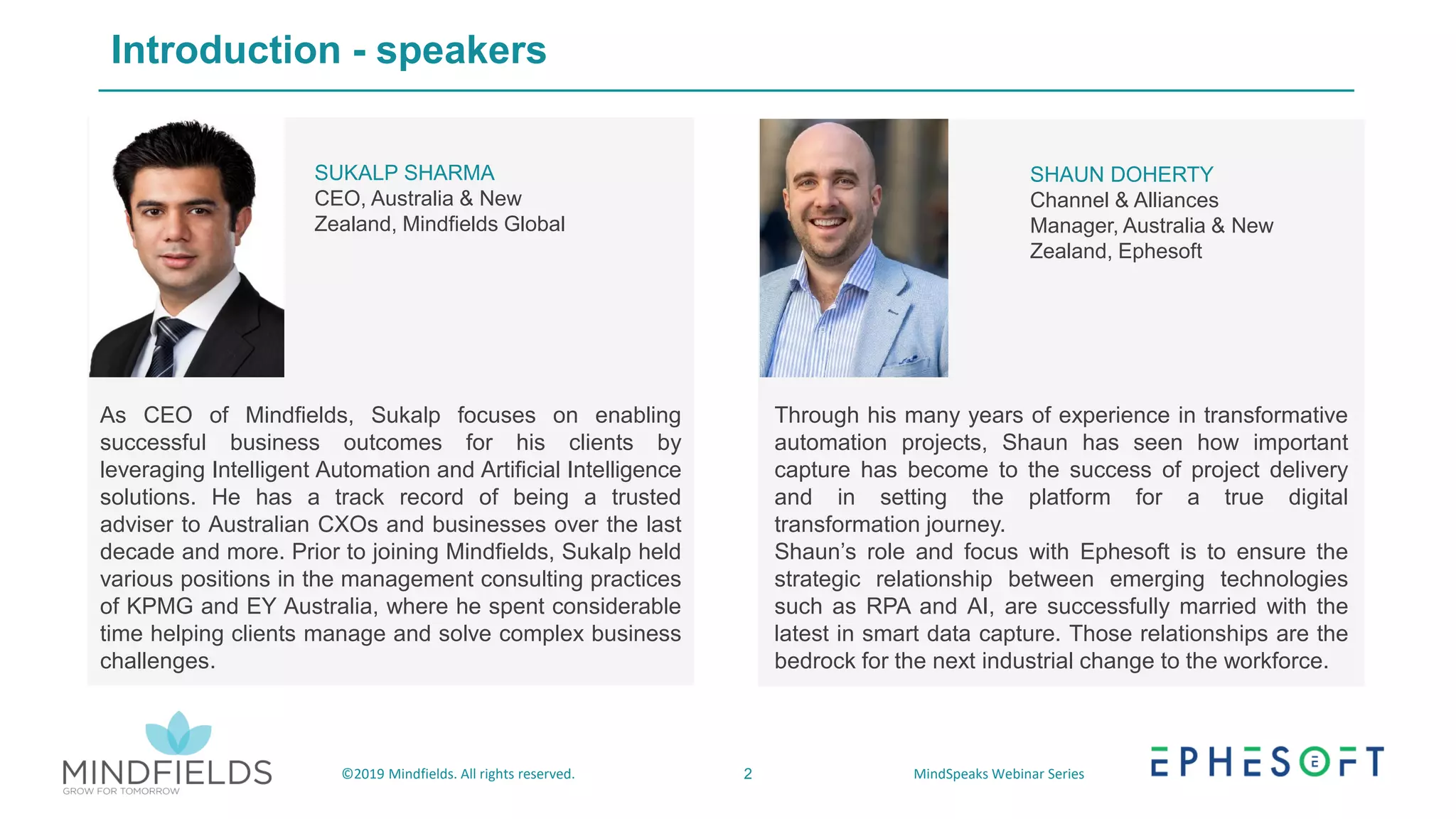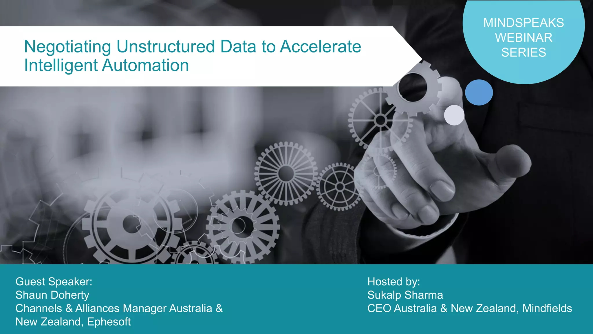 The Mindspeaks webinar series, featuring speakers Sukalp Sharma from Mindfields and Shaun Doherty from Ephesoft, focuses on the importance of smart document capture and its role in intelligent automation. It discusses how enhanced machine learning can improve scalability and the significance of pairing document capture technologies with robotic process automation (RPA) for operational efficiency. The session highlights key takeaways, including the challenges organizations face with unstructured data and offers insights into successful use cases in industries like finance.