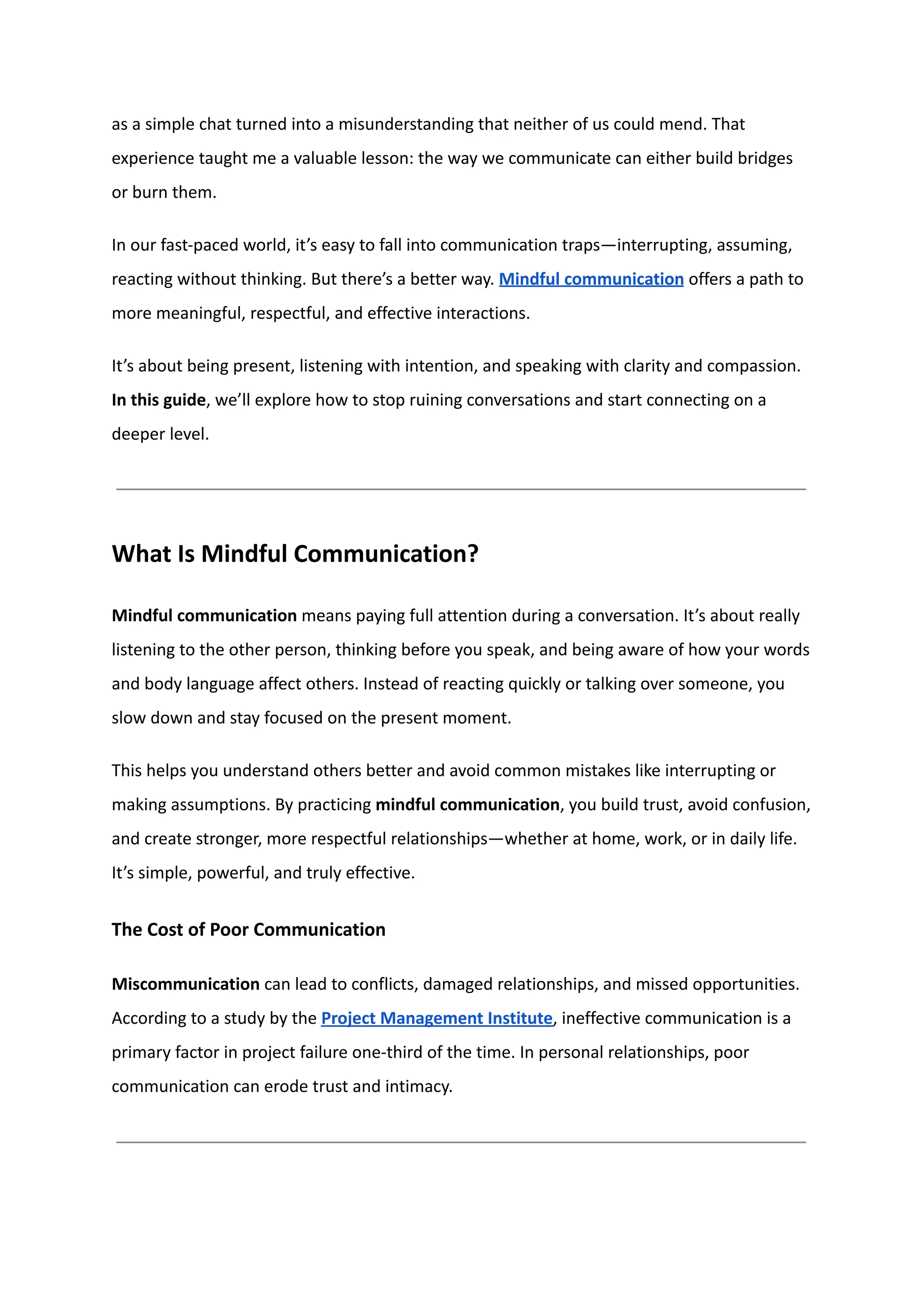 Mindful communication is the practice of being fully present in conversations. It helps reduce misunderstandings, boost emotional intelligence, and improve relationships. By listening actively, managing emotions, asking thoughtful questions, and reflecting daily, you can avoid common pitfalls like interrupting, multitasking, or reacting too quickly.