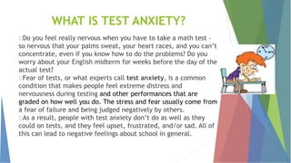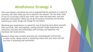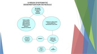 Mindfulness-based systematic desensitization is a technique used to gradually reduce test anxiety through relaxation and exposure to anxiety-provoking test situations. It involves two phases: 1) Practicing relaxation through automatic abdominal breathing exercises for 3 weeks to learn deep breathing. 2) Practicing systematic desensitization for 5 weeks by facing frightening test-related situations while remaining calm, to replace the anxiety response with relaxation through counterconditioning. The goal is to overcome test anxiety by gradually reducing fear when exposed to anxiety-provoking test situations while maintaining a calm, focused state of mind.