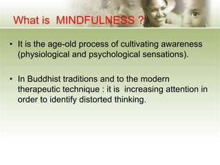 This document discusses mindfulness and flow. It defines mindfulness as cultivating awareness of one's physiological and psychological sensations in the present moment. Mindfulness involves focusing attention on the breath or other objects in a non-judgmental way. Flow is described as a mental state of full focus and enjoyment during an activity. The document outlines various qualities of mindfulness like non-judging, acceptance, and patience. It also discusses factors that can lead to a state of flow like clear goals, immediate feedback, and intrinsic motivation from an activity.