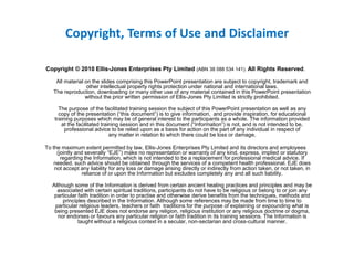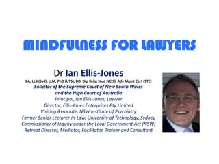 The document presents a training session on mindfulness specifically tailored for legal practitioners, aiming to enhance their well-being, effectiveness, and coping skills in the workplace. It emphasizes mindfulness as a cognitive ability, a coping mechanism, and a means to improve interpersonal skills without endorsing any particular religious context. The presentation includes practical exercises, theoretical insights, and anticipates that participants will gain a foundational understanding of mindfulness and its applications in their professional lives.