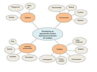 This document provides guidance on developing an appropriate outdoor learning environment for toddlers. Key aspects discussed include having an open-air setting with playground equipment surrounded by a natural environment. The location is specified as being outside with an outdoor situation to allow toddlers and young children to engage in recreational activities and games as part of their early childhood learning and development.