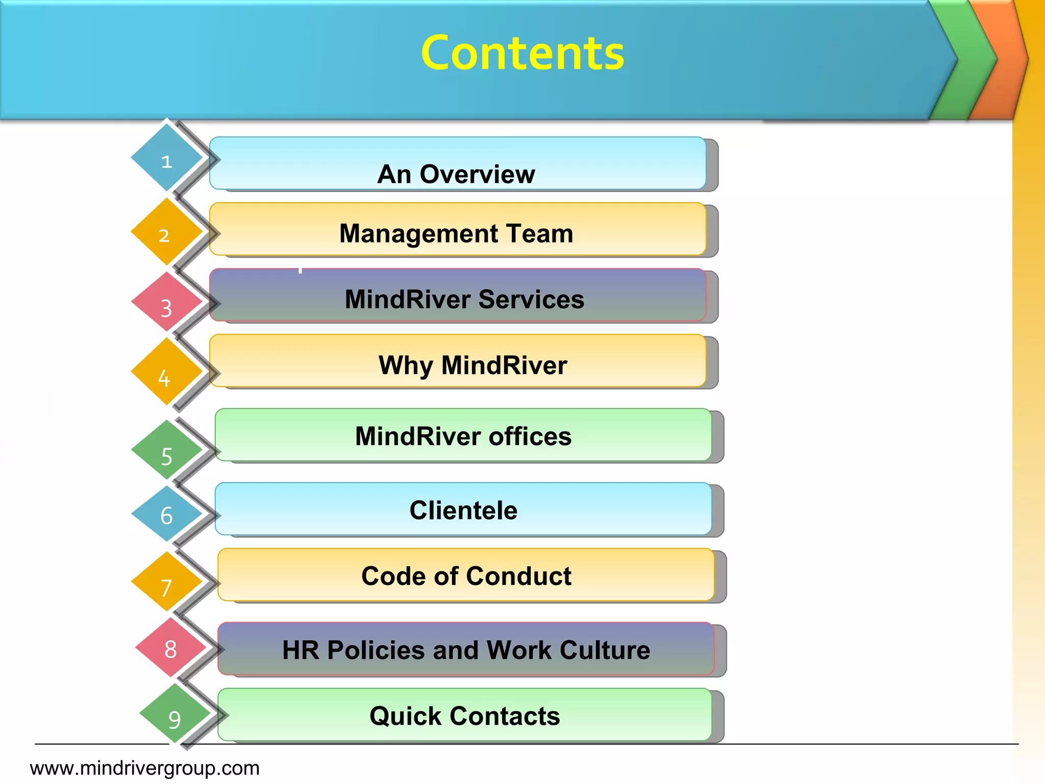 MindRiver is an IT services company based in Bangalore, India with over 430 employees that provides services such as software development, infrastructure management, and cloud computing. It has offices in Bangalore, Chennai, Delhi, and Kolkata and works with clients such as HP, Acer, and Lucent. The document outlines MindRiver's services, management team, clientele, code of conduct, HR policies, and contact information.
