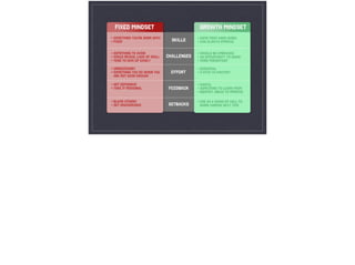 The document describes the author's experience failing to win first place in a business plan competition despite preparing for months. She realized she did not properly prepare for the final presentation because she thought she had it "nailed" without needing more practice. The document then discusses Carol Dweck's research on mindsets, contrasting a fixed mindset that believes talents are innate with a growth mindset that sees abilities as developable through effort. Having a growth mindset was shown to lead to better grades, performance, and persistence among students and relationships. The final sections provide tips for developing a growth mindset, such as focusing on learning goals, embracing challenges, and understanding that abilities grow through continuous effort.