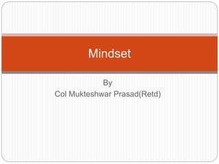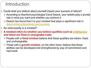 The document discusses the concept of mindset, distinguishing between fixed and growth mindsets as explored by psychologist Carol Dweck. It explains that individuals with a growth mindset view challenges as opportunities for learning, while those with a fixed mindset may feel threatened by challenges and are less likely to strive for improvement. Furthermore, it emphasizes the importance of fostering a growth mindset, particularly in children, to enhance resilience, achievement, and a love for learning.