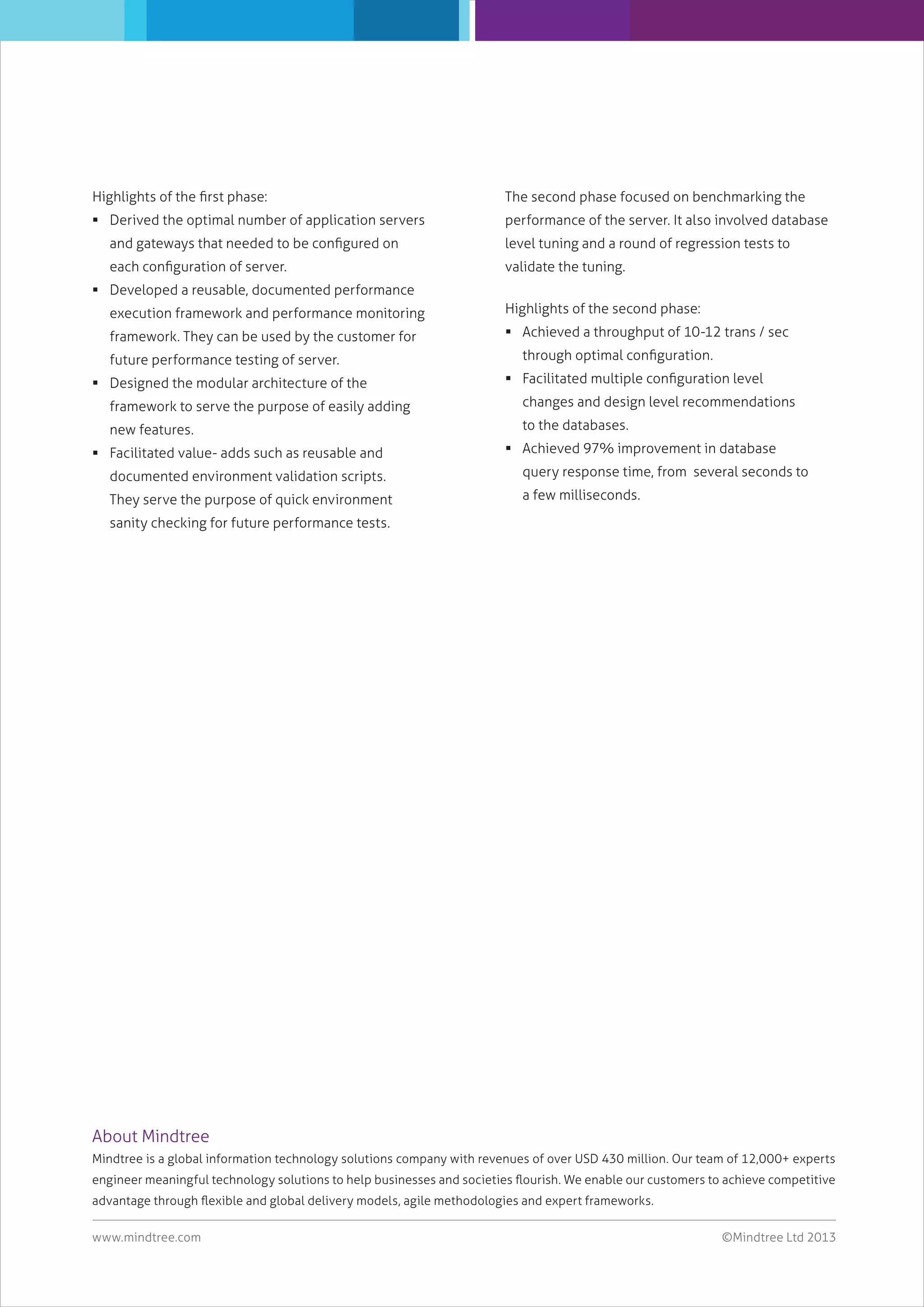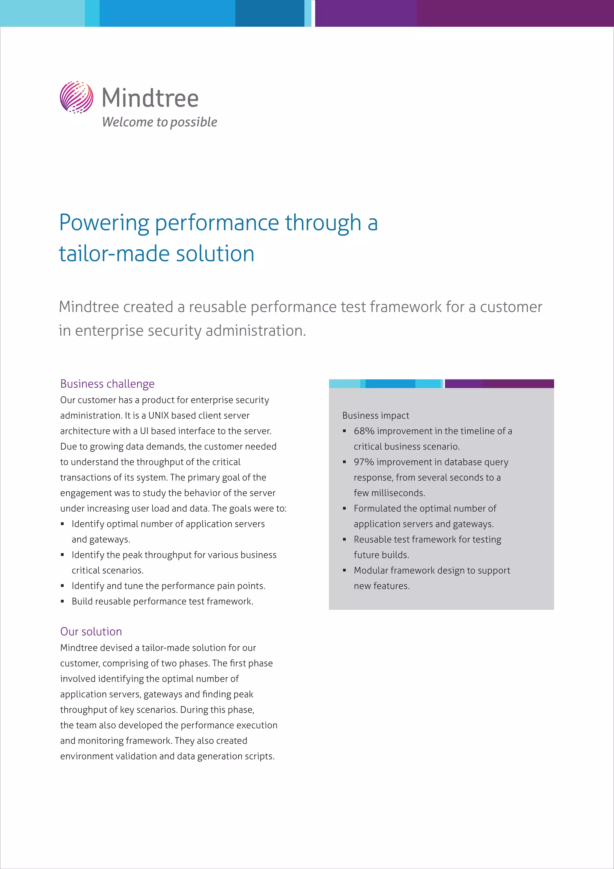 Mindtree developed a reusable performance test framework for a client's enterprise security product, resulting in a 68% improvement in operational timelines. The solution involved two phases: identifying optimal server configurations and benchmarking server performance, achieving significant enhancements including a 97% reduction in database query response time. Additionally, a modular framework was created to facilitate future testing and accommodate new features.