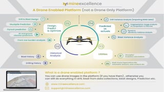 The document discusses various applications of drone data and MineExcellence's drone platform for mining operations. Some key applications mentioned include blast design and optimization, drilling and MWD data collection and analysis, blast information management, fragmentation analysis, and utilities like volumetric analysis. The platform allows import of various file formats from drone surveys and integration of drilling and blast data to optimize blast design and assess variances. Case studies demonstrate benefits like faster data processing, improved recovery and accuracy, and potential cost savings from reducing overdrilling.