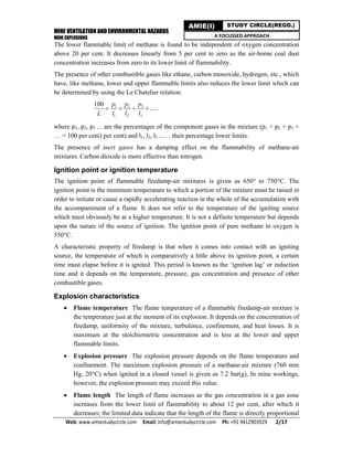 Methane gas is released from coal seams during mining, posing an explosion hazard if allowed to accumulate between its lower (5%) and upper (15%) explosive limits in air. Proper mine ventilation is needed to dilute methane concentrations and prevent explosions from sparks or flames. When methane burns or explodes, it produces carbon dioxide, water vapor and heat. Preventive measures include adequate ventilation, prohibiting smoking and open flames, monitoring methane levels, maintaining electrical equipment, and controlling methane emissions from abandoned areas and coal faces.