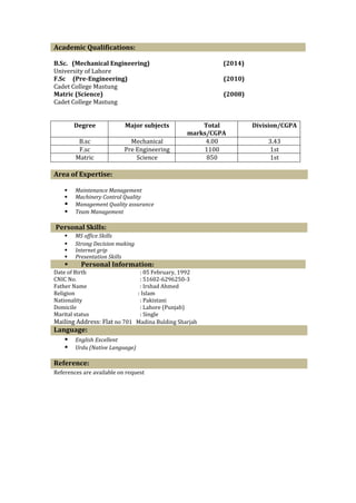Humayun Hassan is seeking a job as a maintenance and quality assurance engineer. He has over 5 years of experience in quality control and assurance roles at manufacturing companies. His responsibilities included monitoring quality and compliance targets, auditing products, ensuring regulatory compliance, and managing a team. Hassan has a B.Sc. in Mechanical Engineering and experience in time studies, quality inspection, and various manufacturing processes. He is proficient in maintenance management, machinery control, quality assurance, and team management.