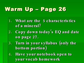 1) Minerals are identified by their hardness, color, streak, luster, density, crystal system, cleavage/fracture, and special properties like fluorescence or magnetism.