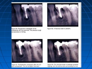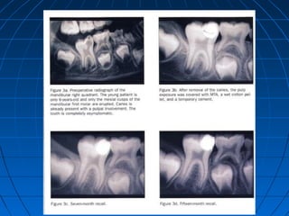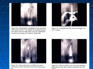 The document summarizes properties and clinical applications of mineral trioxide aggregate (MTA). MTA was introduced in 1993 as a root-end filling material and to repair lateral perforations. It has received FDA approval. MTA is biocompatible and promotes regeneration when placed in contact with tissues. It exists in gray and white forms. MTA has excellent sealing ability and marginal adaptation compared to other materials. It induces hard tissue formation and has dentinogenic effects when used for pulp capping or pulpotomy. MTA demonstrates regenerative capabilities and stimulates tissue healing.