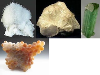 2. Minerals are classified based on their crystal structure and chemical composition into groups like the silicate, quartz, feldspar, pyroxene, amphibole, and mica groups. Example minerals from each group like quartz, orthoclase, augite, hornblende, and muscovite are described.