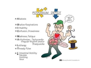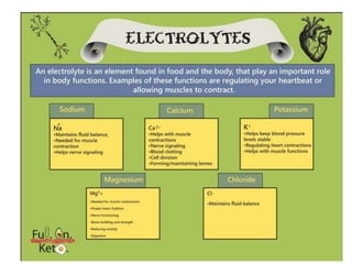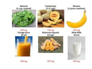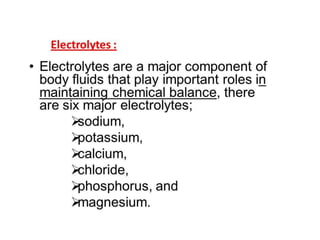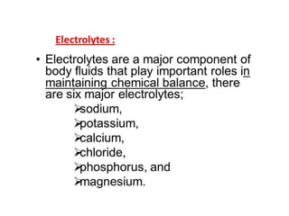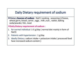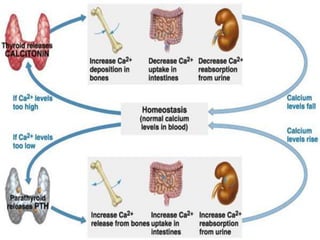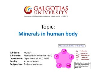 Minerals play essential roles in the human body. This document discusses several important minerals, including calcium and iron. Calcium is critical for bone and teeth formation, muscle contraction, nerve conduction, and blood coagulation. Homeostasis of calcium levels is regulated by calcitriol, parathyroid hormone, and calcitonin. Disorders can result in hypercalcemia or hypocalcemia. Iron is essential for tissue respiration, oxygen transport, and immune function. Iron absorption is regulated by stores in the body and occurs primarily in the duodenum. Iron deficiency is a concern, especially in women, and dietary sources and requirements are discussed.