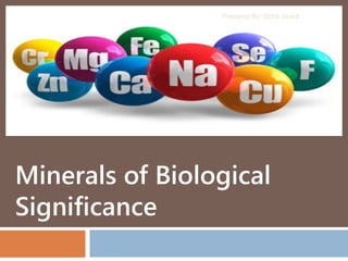This document discusses several important minerals for human health including calcium, iron, phosphorus, and zinc. It provides information on their sources, roles in the body, deficiency symptoms, and significance. Specifically, it notes that calcium is essential for bone growth and health and is found in dairy products. Iron deficiency can cause anemia and fatigue and is obtained from meat, eggs, and leafy greens. Phosphorus is vital for bone structure and cell processes and is present in dairy, while zinc supports immune function and healing and is found in seafood, nuts and dairy. The document emphasizes the wide-ranging effects of mineral deficiencies on physical and mental well-being.