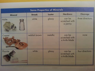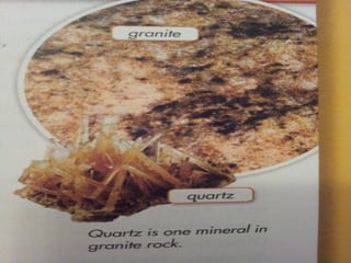 Minerals and rocks are natural, non-living materials. Minerals are the building blocks of rocks and give rocks their properties. There are three main types of rocks: igneous, sedimentary, and metamorphic. Igneous rocks form from cooled lava or magma underground or at the Earth's surface. Sedimentary rocks form from compressed and cemented sediments over millions of years. Metamorphic rocks were originally igneous or sedimentary rocks that were changed by heat and pressure within the Earth.