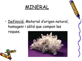 MINERAL Definició: Material d’origen natural, homogeni i sòlid que compon les roques.