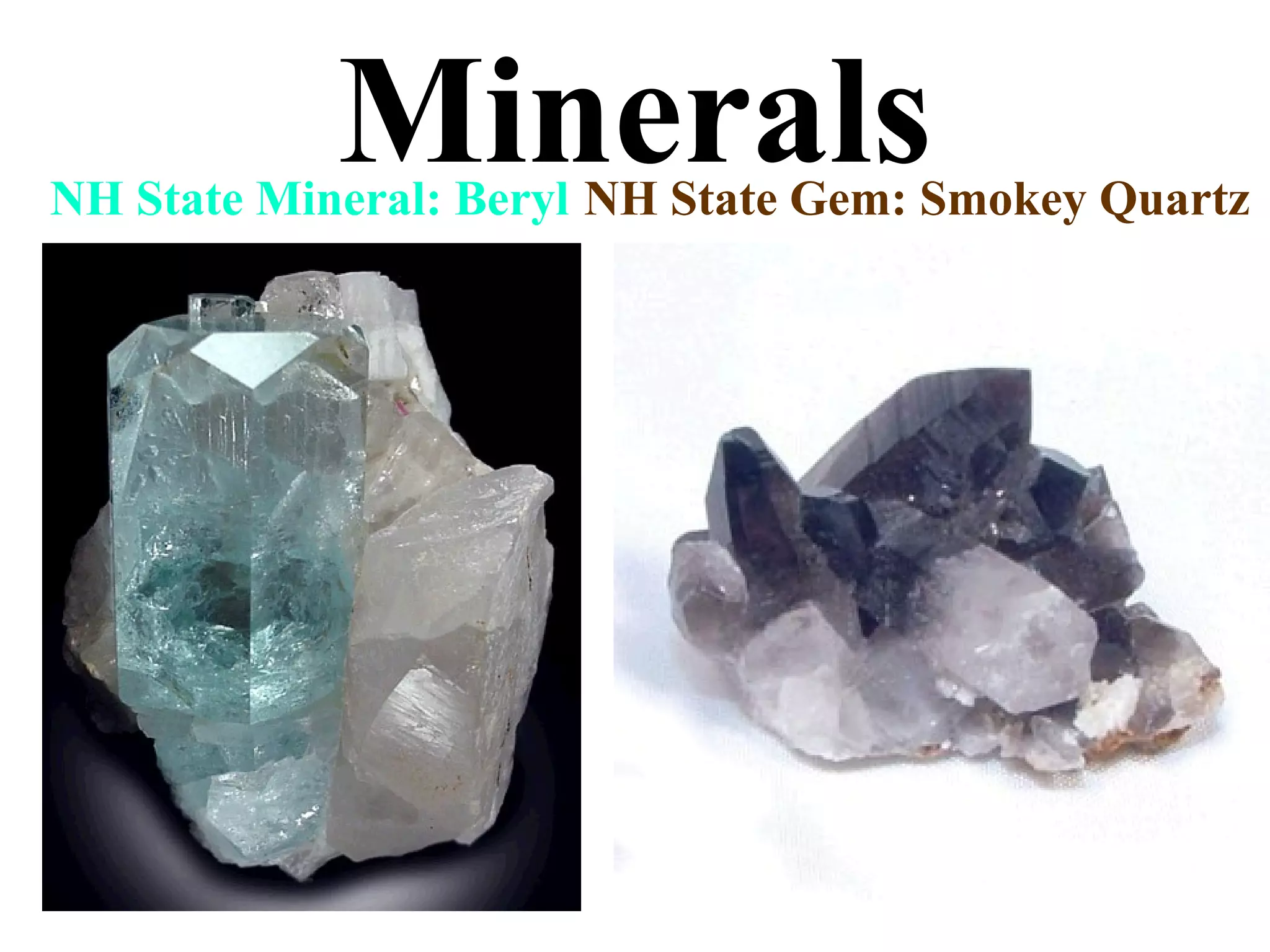 The document summarizes key mineral properties including New Hampshire's state mineral (beryl) and gem (smokey quartz). It describes physical properties such as crystal shape, luster, color, streak, hardness, cleavage, fracture and specific gravity. It also discusses major mineral groups including silicates, carbonates, oxides, sulfides, phosphates and provides examples of minerals that fall within each group.