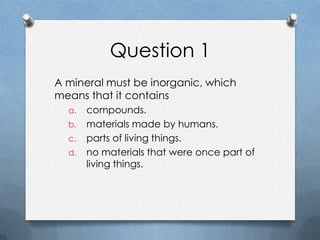 This document contains 10 questions about minerals and answers the questions. It tests knowledge about the definitions of minerals, including that minerals must be inorganic, form repeating crystalline patterns, and can form through crystallization of magma. It also covers hardness of common minerals on the Mohs scale such as diamond, quartz and talc. The questions assess understanding of how minerals form inside the Earth and on its surface.
