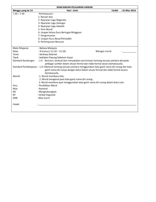 Dokumen ini adalah rancangan pelajaran harian yang merangkumi aktiviti dari minggu ke-12 hingga minggu ke-13 bagi pelbagai mata pelajaran seperti Bahasa Malaysia, Matematik, dan Pendidikan Jasmani. Setiap sesi termasuk objektif, aktiviti, dan tema, serta penekanan pada perkembangan kemahiran sosial dan kesihatan. Fokus utama adalah memastikan murid terlibat aktif dalam pembelajaran melalui interaksi dan pemahaman konsep.